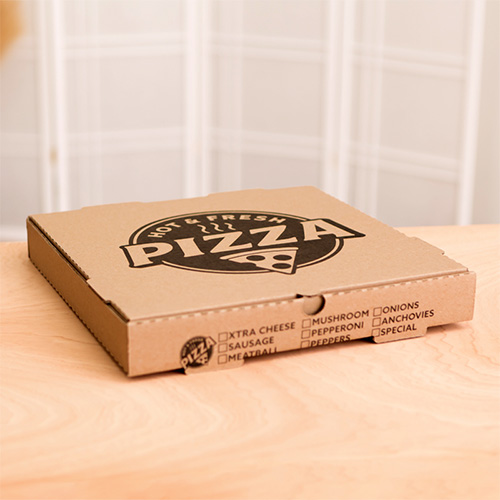 You can order as few as 50 custom-printed pizza boxes.